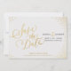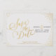 A caligrafia de aluguel de ouro falsa, que brilha nas mãos, salva a data design e os pontos dourados confetti sobre fundo branco, efeito brilhante de ouro metálico bonito, moderno, chic, elegante e clássico, perfeito para casamento vintage, casamento ou casamento no inverno de arte deco. Cor de fundo editável para corresponder às cores do tema do casamento. Personalize o seu próprio cartão de data para o seu convite de casamento. Veja a seguir todas as peças correspondentes nesta coleção de caligrafia luxuosa com brilho.