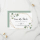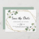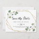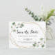 Este casamento horizontal com caligrafia geométrica verde, exceto a data é perfeita para um casamento rústico. A design apresenta galhos botânicos verdes de eucalipto, desenhados à mão, e folhas enfeitando uma elegante armação de ouro.