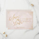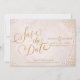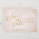 A caligrafia de inscrição manual glamor faux glitter rosa gold salva a data design e o rosa pote dourado confetti no fundo pastel cor-de-água rosa, efeito brilhante metálico-brilhante rosa-ouro metálico bonito, moderno, chico, elegante e clássico, perfeito para o casamento vintage ou o casamento da primavera. Personalize o seu próprio cartão de data para o seu convite de casamento. Veja todas as peças correspondentes nesta coleção de caligrafia de rosa dourada esfregada abaixo.