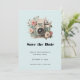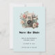 Save the date card with a vintage styled camera decorated with flowers. Pastel colors of pink, cream and green.