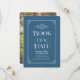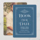 Anuncie seu casamento com este elegante save the date projetado para se parecer com uma capa de livro antigo em azul índigo suave. A ornamentada borda decorativa com detalhes elegantes nos cantos emoldura a tipografia "Reserve a Data" em negrito com acentos de caligrafia floreada. Os nomes do casal, data e local são apresentados em texto creme refinado, com o verso apresentando uma foto de noivado completa. Uma escolha perfeita para amantes de livros e casamentos com tema literário. Todo o texto e foto são totalmente editáveis.