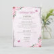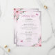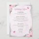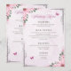 Descrição: Um cardápio de casamento lindamente desenhado, apresentando uma borda floral cor-de-rosa pastel com borboletas e acentos de verdejante. O cardápio é dividido em seções: Aperitivos (Salada de Jardim com Vinagrete Balsâmico, Sopa de Tomate com Manjericão), Prato Principal (Frango Grelhado com Purê de Batata com Alho e Legumes no Vapor, Salmão Grelhado com Arroz Pilaf e Aspargos, Massa Vegetariana com Molho de Tomate Fresco e Parmesão), Sobremesas (Bolo de Casamento de Baunilha com Creme de Manteiga, Brownies de Chocolate, Salada de Frutas Frescas) e Bebidas (Água com Gás, Limonada, Chá & Café). A tipografia elegante e a paleta de cores suaves criam uma atmosfera
