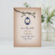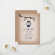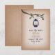 Um casamento salvou a data com a ilustração de uma lanterna azul de acampamento pendurada num galho de árvore com folhas verdes. Personalize o texto. O fundo é inspirado no estoque de papelão. Procure por convites de casamento e outros itens de coordenação na Paperie de Jill.