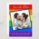 Este cartão de aviso de casamento corajoso com arco-íris apresenta uma foto de noivado LGBTQ romântica personalizada para um casal gay ou lésbica que adora anúncios brilhantes e coloridos. Personalize este cartão de fotografia de aviso de casamento LGBT alegre com seus nomes, data e local.