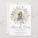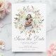 Uma elegante moldura circular de peônias cor-de-rosa em aquarela e rosas creme marfim emoldura este adorável convite de foto para salvar a data de verão. Os ramos botânicos de folhas de eucalipto verde-sage decoram