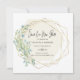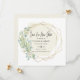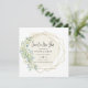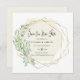 Uma maneira elegante de deixar amigos e familiares saberem que você remarcou seu casamento. Um quadro geográfico dourado envolve os detalhes da data do casamento. O fundo branco de marfim destaca o texto. Salve nossa nova data é escrita em um script moderno, com detalhes a seguir. Flores azuis muito bonito estão aninhadas em folhas verdes de folhagem sage que decoram o quadro de ouro geométrico. O plano de fundo do novo cartão de data é bege.