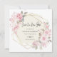 Uma maneira elegante de deixar amigos e familiares saberem que você remarcou seu casamento. Um quadro geográfico dourado envolve os detalhes da data do casamento. O fundo branco de marfim destaca o texto. Salve nossa nova data é escrita em um script moderno, com detalhes a seguir. Flores roxas e brancas muito bonito são aninhadas em folhas de folhagem verde que decoram a estrutura geométrica de ouro. O plano de fundo do novo cartão de data é bege.