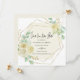 Uma maneira elegante de deixar amigos e familiares saberem que você remarcou seu casamento. Um quadro geográfico dourado envolve os detalhes da data do casamento. O fundo branco de marfim destaca o texto. Salve nossa nova data é escrita em um script moderno, com detalhes a seguir. As rosas brancas muito bonito aninhadas em folhas verdes de sábio decoram a estrutura geométrica de ouro. O plano de fundo do novo cartão de data é bege.