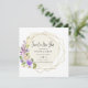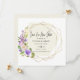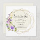 Uma maneira elegante de deixar amigos e familiares saberem que você remarcou seu casamento. Um quadro geográfico dourado envolve os detalhes da data do casamento. O fundo branco de marfim destaca o texto. Salve nossa nova data é escrita em um script moderno, com detalhes a seguir. Flores roxas e brancas muito bonito são aninhadas em folhas de folhagem verde que decoram a estrutura geométrica de ouro. O plano de fundo do novo cartão de data é bege.