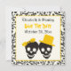 Casamento amarelo preto no Halloween Salve o anúncio da data mostrando uma noiva de casal do crânio preto e noiva em fundo de marfim junto com uma borda padrão do crânio. O noivo veste um chapéu amarelo e a noiva um arco amarelo.