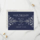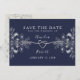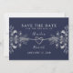 O elegante roteiro de caligrafia moderno casamento azul marinho salvar o convite de data com simples corda prateada e um lugar floral dourado.