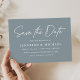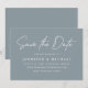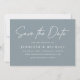 Simples salve o cartão de data com "Salvar a Data" em um script manuscrito branco com um fundo azul empoeirado. Personalize o cartão de data moderno adicionando seus nomes, data do casamento, local do casamento, site do casamento, etc. O minimalista salve a placa de data reverte para exibir um fundo azul empoeirado sólido com espaço para texto e fotos adicionais.