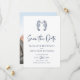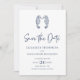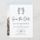 Este clássico cartão de salvar a data de casamento branco e azul-marinho minimalista é perfeito para casamentos temáticos costeiros e náuticos e casamentos de destino de praia, com 2 cavalinhos-marinhos fofos se beijando no topo, script de caligrafia moderna e um modelo de foto no verso.
