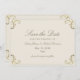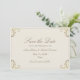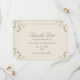 Casamento elegante creme e barroco-ouro exceto cartão de data com ouro ornamentado floresce, caligrafia clássica e monograma personalizado no verso. Perfeito para casamentos formais e luxuosos, este design eterno o ajuda a anunciar seu grande dia em estilo sofisticado. Os convidados vão adorar os detalhes do barroco real e o toque personalizado do monograma, fazer que seja uma peça de papelaria digna de ser guardada.