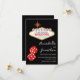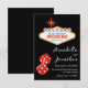 Este convite de casamento personalizado para salvar a data apresenta um tema de cassino de Las Vegas em um fundo preto. O clássico sinal de Bem-vindo a Las Vegas é impresso no topo com texto de exemplo que você pode personalizar. Um par de dados brilhantes vermelhos é impresso na parte inferior, Os nomes do casal e a data do casamento de exemplo são impressos à direita dos dados em uma fonte preta elegante.