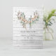 Cartão de salvar a data de casamento boêmio em seda rústica marrom empoeirada com bolas de algodão e folhas de eucalipto, com penas e chifres boho.