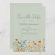 Este design boho rústico apresenta uma borda de aquarela de flores silvestres laranja e azuis na parte inferior. As palavras "Salve a Data" e os nomes do casal aparecem em uma elegante escrita à mão em cinza carvão, com o texto restante em fonte sans serif em um fundo verde salvia.
