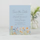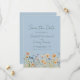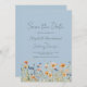 Este design rústico boho apresenta uma fronteira de aquarela de flores silvestres laranja e azuis ao longo da parte inferior. As palavras "Salve a Data" e os nomes do casal aparecem em elegante letra manuscrita cinza carvão, com o texto restante em fonte sans serif em um fundo azul poeirento.
