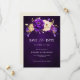Cartão de aviso de casamento com tema dourado roxo real elegante, apresentando um buquê elegante de flores de rosa roxa real, índigo, dourado, amarelo e botões de flores e folhas de eucalipto. Por favor, entre em contato comigo para qualquer ajuda na personalização ou se você precisar de qualquer outro produto com este design.