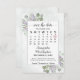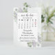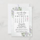 Este casamento para salvar o cartão de data é simples, rústico, elegante e bonito. Apresenta um calendário personalizável com um coração à volta da data do seu casamento, num quadro branco rodeado por um bando de folhas de cor aquosa pintadas à mão, de eucaliptos e flores lavandas, num fundo de cinza azul marmoreado e empoeirado. O título diz: Salve a Data na caligrafia de script lacy com espaço para os nomes do casal, a data e o local. A parte traseira tem um pequeno buquê amarrado com um arco branco. Uma maneira maravilhosa de deixar seus amigos e família saberem sobre seu próximo casamento.