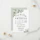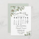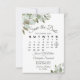 Este belo cartão de encontro vai avisar seus amigos e família sobre seu próximo casamento. Apresenta um elegante design de bolo com um calendário personalizável do mês do seu casamento com um coração à volta do dia especial, rodeado por folhas de eucalipto e verde num fundo branco. Há espaço para seus nomes, a data do casamento e a localização. A parte de trás apresenta um buquê de folhagem rústico, amarrado com uma fita branca e um arco.