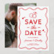 Delicie-se com o charme dos nossos cartões de casamento save the date caprichosos e desenhados à mão. Cada cartão é uma obra de arte com ilustrações divertidas de rabiscos vermelhos, bordas de fita, corações de amor e alianças de casamento. Desenhados em um fundo branco fresco e personalizados com sua foto, esses cartões são mais do que um anúncio – são o primeiro capítulo da sua história de casamento.