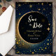 Marque o tom para uma celebração mágica com esta Noite Estrelada Celestial Elegante do Crescente Místico Elegante Salve a Data. Projetada com um fundo profundo e temperado com uma lua crescente brilhante, estrelas cintilantes e delicados sotaques celestes em ouro falso, esta carta captura o romance do cosmos. Perfeito para temas de casamento celestiais, boho ou lua, promete uma noite inesquecível sob as estrelas. Avise aos seus hóspedes que uma celebração sonhadora aguarda.