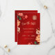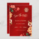 Este convite tradicional para o casamento chinês pinta peões em tons vermelhos, amarelos e neutros num fundo floral vermelho brilhante. Salve o texto da data em um script manuscrito elegante. Produtos de casamento chineses correspondentes disponíveis.