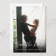 Este simples e moderno cartão de save-the-date de foto com script apresenta sua foto especial sobreposta com um save-the-date em script acima de seus nomes, data e local em texto branco.