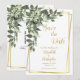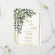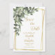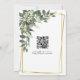 Um lindo verde com flores brancas e uma moldura dourada Casamento Save the Date. Código QR no verso para enviar os convidados ao seu site.
