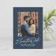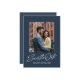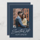 Este convite de "salve a data" elegante apresenta uma escrita inspirada no estilo retrô "salve a data" sob uma única foto em um fundo azul-navy clássico, juntamente com um texto personalizado simples. O verso deste convite de "salve a data" moderno tem uma faixa azul correspondente, juntamente com uma foto horizontal, espaço para uma mensagem personalizada e um código QR para o site do seu casamento. Este design vertical é ótimo para um casal moderno e elegante e é uma ótima maneira para o casal comprometido compartilhar informações do casamento com amigos e familiares. Encontre mais cores e estilos na coleção de Lea Delaveris Design. Também disponível como download digital de convite de "salve a data".