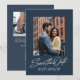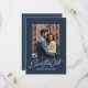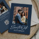 Este convite de save the date elegante apresenta uma escrita inspirada no estilo retrô "save the date" sob uma única foto em um fundo azul-marinho clássico, juntamente com um texto personalizado simples. O verso deste save the date moderno tem uma faixa azul coordenada juntamente com uma foto horizontal, espaço para uma mensagem personalizada e um código QR para o site do seu casamento. Este design vertical é ótimo para um casal moderno e elegante e é uma ótima maneira para o casal compartilhar informações do casamento com amigos e familiares. Encontre mais cores e estilos na coleção de Lea Delaveris Design. Também disponível como download digital de save the date.