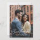 Este convite de "save the date" elegante apresenta um texto com inspiração retrô "save the date" em branco em uma foto vertical completa, juntamente com um texto personalizado simples. O verso deste "save the date" moderno tem uma faixa preta elegante, juntamente com uma foto horizontal, espaço para uma mensagem personalizada e um código QR para o site do seu casamento. Este design vertical é ótimo para um casal moderno e elegante, e é uma ótima maneira para o casal de noivos compartilhar informações do casamento com amigos e familiares. Encontre mais cores e estilos na coleção de Lea Delaveris Design. Também disponível como download digital de "save the date".
