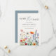Anuncie a data do seu casamento com uma elegância atemporal usando este Save the Date de casamento em Script Floral Elegante em azul empoeirado com flores silvestres delicadas. Este design refinado apresenta uma ilustração de flores silvestres em aquarela suave, combinada com caligrafia em script graciosa e tipografia serif clássica em um fundo marfim, misturando charme botânico romântico com sofisticação moderna.