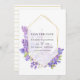 Convite de casamento floral em violeta - lilás aquarelado com uma moldura geométrica de herbário dourado personalizável para os detalhes do seu evento. Ideal para qualquer tema ou casamento no jardim.