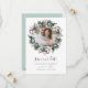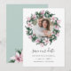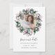 Elegante botânico salva as datas tem uma foto de noivado favorita cercada por uma coroa redonda de flores magnólias cor-de-rosa e folhas de eucalipto em uma elegante paleta de aquarela rosa e verde. Cartões invertidos num verde rico com flores coordenadas. Personalize com seus nomes, data do casamento e local. Outras cores estão disponíveis