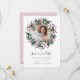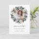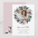 Elegante botânico salva as datas tem uma foto de noivado favorita cercada por uma coroa redonda de flores magnólias cor-de-rosa e folhas de eucalipto em uma elegante paleta de aquarela rosa e verde. A carta inverte-se em um rosa macio rico com flores coordenadas. Personalize com seus nomes, data do casamento e local. Outras cores estão disponíveis