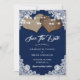 Casamento rústico de marinho salve o cartão de data com corações de burlap em um fundo hessiano decorado com rendas florais brancas e luzes de cordas.