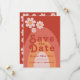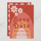 O casamento laranja moderno e velho retro dos anos 70 salvo o convite para data. Legal padrão retro-minimalista de margarida com design de arco-íris em laranja e pêssego apricot terracotta. Esta hippy divertida salva o cartão de data é fácil de personalizar usando os modelos simples. Ideal para dar o tom de um primavera de verão ou de outono. Arte original da artista Catherine Sweetman