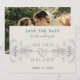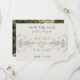 Convite de casamento com caligrafia elegante simples em verde, com foto no verso e detalhes em prata e renda floral dourada.