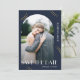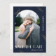 Elegante azul escuro, uma foto com um grande casamento de tipografia, salve o anúncio da data. Este anúncio moderno apresenta uma fotografia em forma de arco, e um impressão de wisp de ouro bonito e simples. Por favor, veja esta coleção de casamento de tendências para coordenar convites de casamento e opções adicionais de cores de chic.