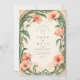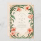 Um convite romântico de casamento floral em forma de coral embrulhado em cipós de Arte Nouveau. Com folhagem verde suavemente curvada e flores radiantes cor-de-rosa-salmão, esta design evoca uma elegância botânica sonhadora, perfeita para um jardim de verão ou casamento romântico inspirado na natureza.