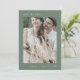 Este casamento da floresta verde da floresta fotográfica, exceto o cartão de data é perfeito para um casamento de destino de madeira. O design verde-sábio escuro apresenta uma tipografia simples e rústica com uma sensação de montanha de floresta. Personalize suas datas com uma foto de noivado, seus nomes e sua data de casamento. Adicione seu site de casamento à parte de trás do cartão.