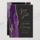 A borda esquerda deste elegante casamento moderno salve o cartão de data apresenta uma cor azul-d-água púrpura e borda com brilho dourado. O texto personalizável combina manuscrito dourado, fontes em copperplate e itálico em um fundo fora de preto. O verso apresenta um design de agate roxo e dourado correspondente.