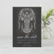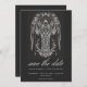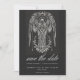 Este casamento salvou a design do cartão de data apresenta um tema escuro e modesto que é simples, mas impressionante. Um anjo encapuzado em desenho de linhas góticas brancas se senta sobre um fundo de carvão com duas tonalidades. Única, misteriosa e elegante, esta design pode ser usada em qualquer estação. Criado pela imprensa simplesmente de farmácia.