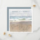 Casamento quadrado do tema Praia Salve o cartão de Data apresenta uma paisagem de ondas do oceano de cor-d'água com "Salvar a Data" escrito na areia. O lado inverso é um azul-marinho claro. Perfeito para casamentos náuticos, tropicais, de destino e costeiros. Trabalho de arte por KL Stock.