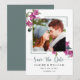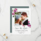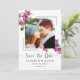 Este moderno cartão de data com flores cor-de-rosa é perfeito para a sua foto de noivado favorita. Há flores de bougainvillea rosa-mediterrânicas e uma foto na frente. Inverte para verde poeirento sólido. Se você precisar de alterações no design, como cor, texto ou fonte; entre em contato conosco em seamistmail@gmail.com. Adoramos fazer parte de suas memórias felizes.