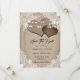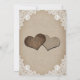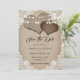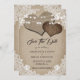 Casamento russo de campo salve o cartão de encontro com corações de burlap em um fundo de burlap decorado com rendas florais brancas e luzes de cordas.
