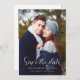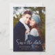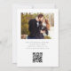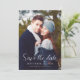 Esta fotografia simples e elegante Guardar a Data apresenta as palavras "Guardar a data" no moderno guião de escrita manual sobre a sua fotografia vertical favorita, juntamente com a data do casamento e a localização na fonte serif. Uma tela de gradiente escuro ajuda a tornar o texto branco pop. No verso, adicione uma segunda foto, juntamente com informações adicionais e um código QR para guiar os convidados ao seu site de casamento.