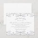 Refinado e glamoroso, este save the date sem foto apresenta bordas de damasco prateado brilhante na parte superior e inferior em um fundo branco crocante com tipografia prateada coordenada. O trabalho de pergaminho ornamentado que o enquadra dá um sentimento formal e luxuoso adequado para casamentos de gala ou de inverno. Todo o texto é totalmente personalizável.